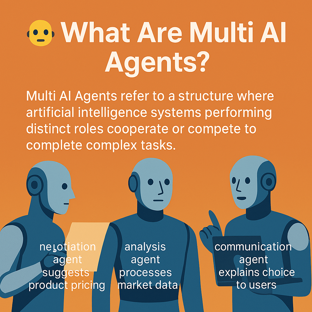 Multi AI Agents refer to a system where multiple AI entities perform different roles and either cooperate or compete to complete complex tasks. Unlike traditional single-purpose AI systems, multi-agent systems actively interact with each other, analyze situations collaboratively, and derive optimal outcomes.